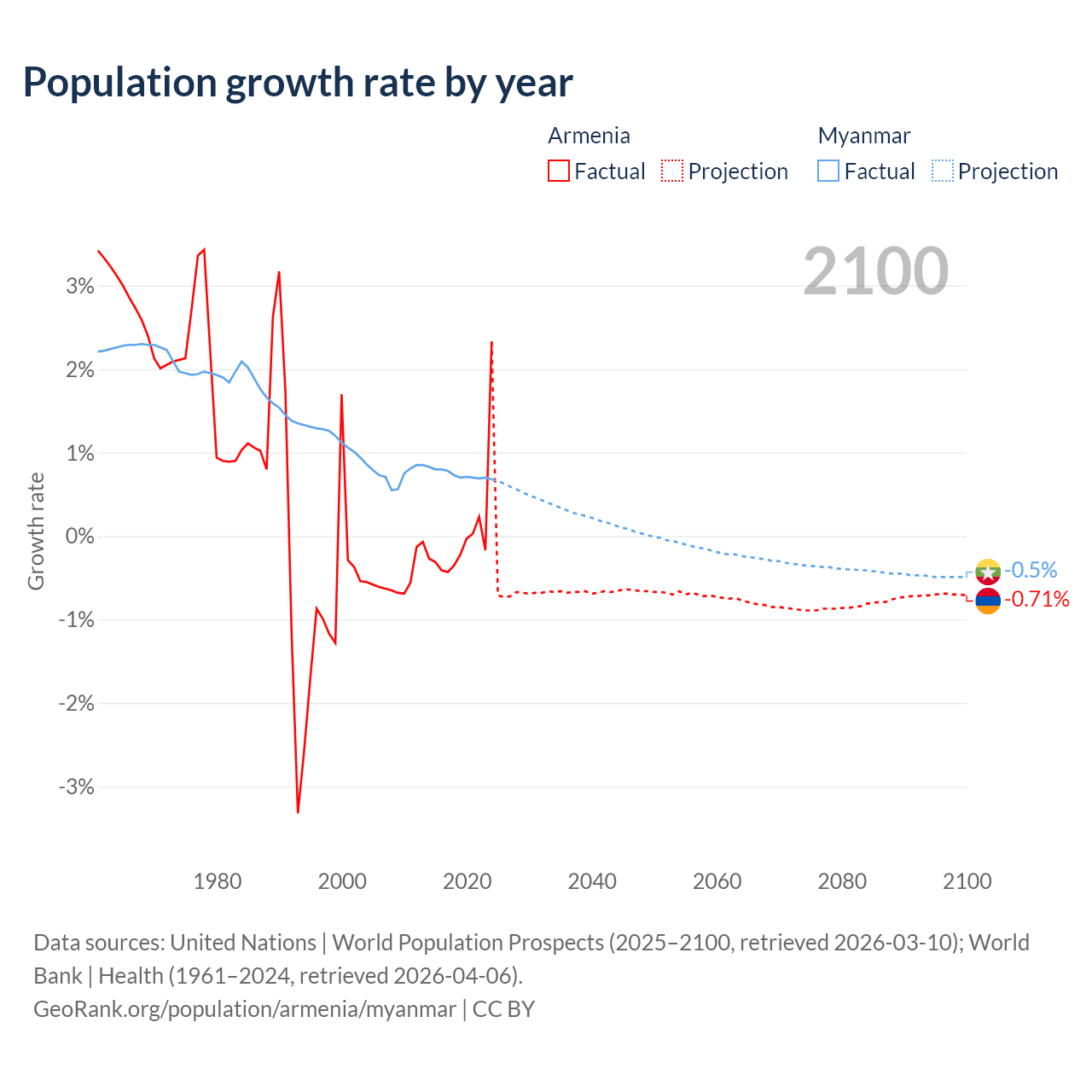 - For the last 10 years, Armenia has had an average growth rate of +0.04% per year vs +0.74% in Myanmar.