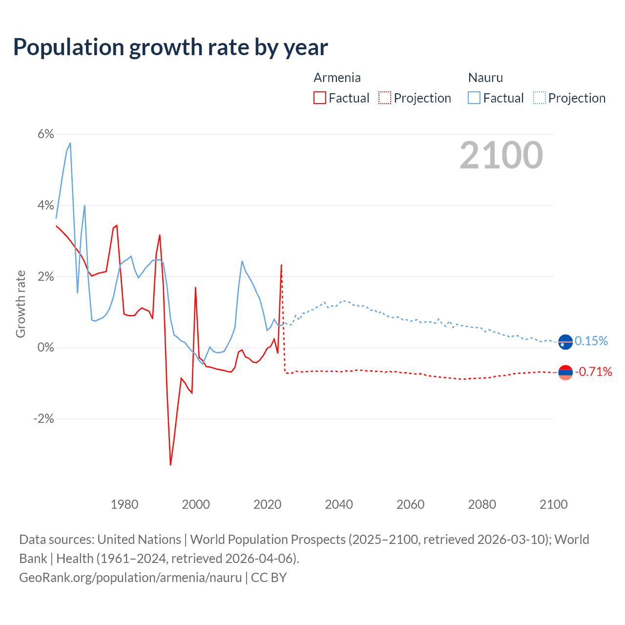 - For the last 10 years, Armenia has had an average growth rate of +0.04% per year vs +1.17% in Nauru.