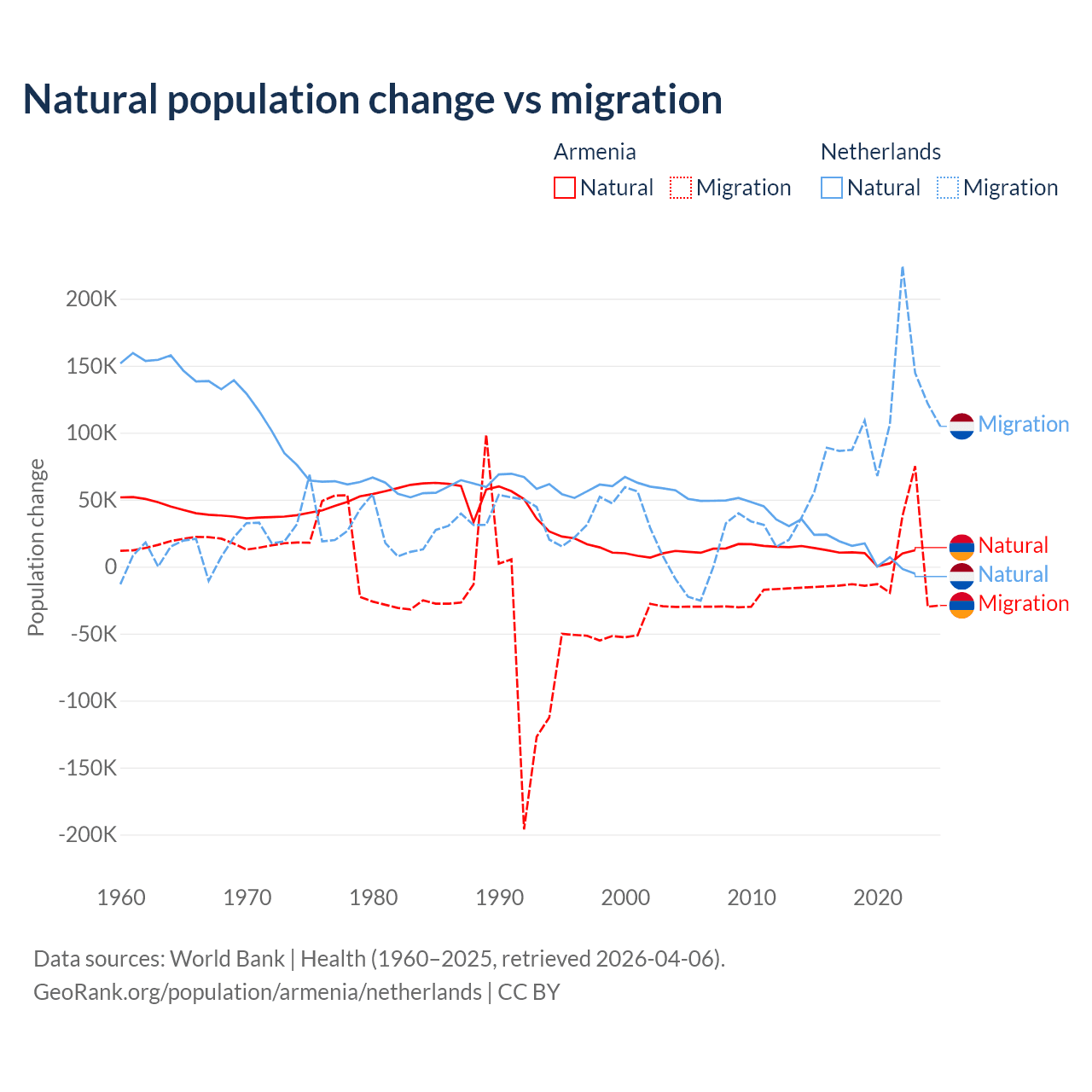 Over the last 10 years, 93.5% of the population change in Armenia is from natural causes (a gain of 97,267 people) and 6.54% is from migration (a loss of 6,808 people). In the Netherlands 11.8% is from natural causes (a gain of 134,554 people) and 88.2% is from migration (a gain of 1,006,495 people).
