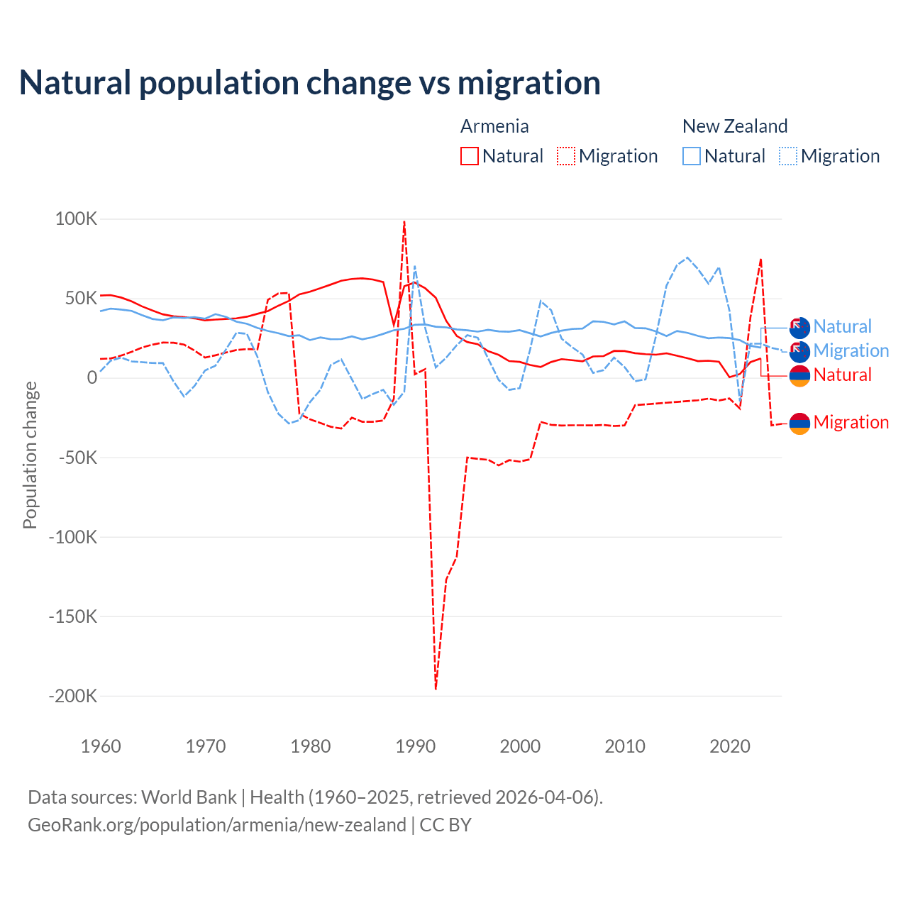 Over the last 10 years, 93.5% of the population change in Armenia is from natural causes (a gain of 97,267 people) and 6.54% is from migration (a loss of 6,808 people). In New Zealand 34.4% is from natural causes (a gain of 247,767 people) and 65.6% is from migration (a gain of 471,602 people).