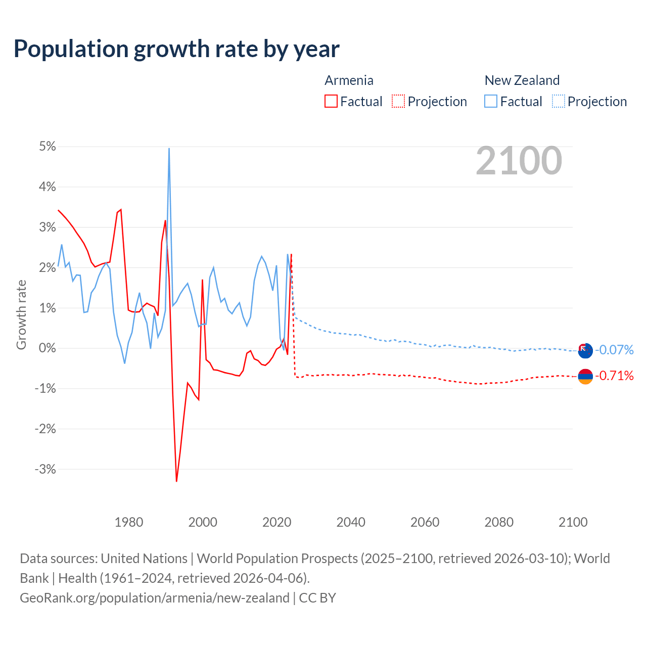 - For the last 10 years, Armenia has had an average growth rate of +0.04% per year vs +1.6% in New Zealand.