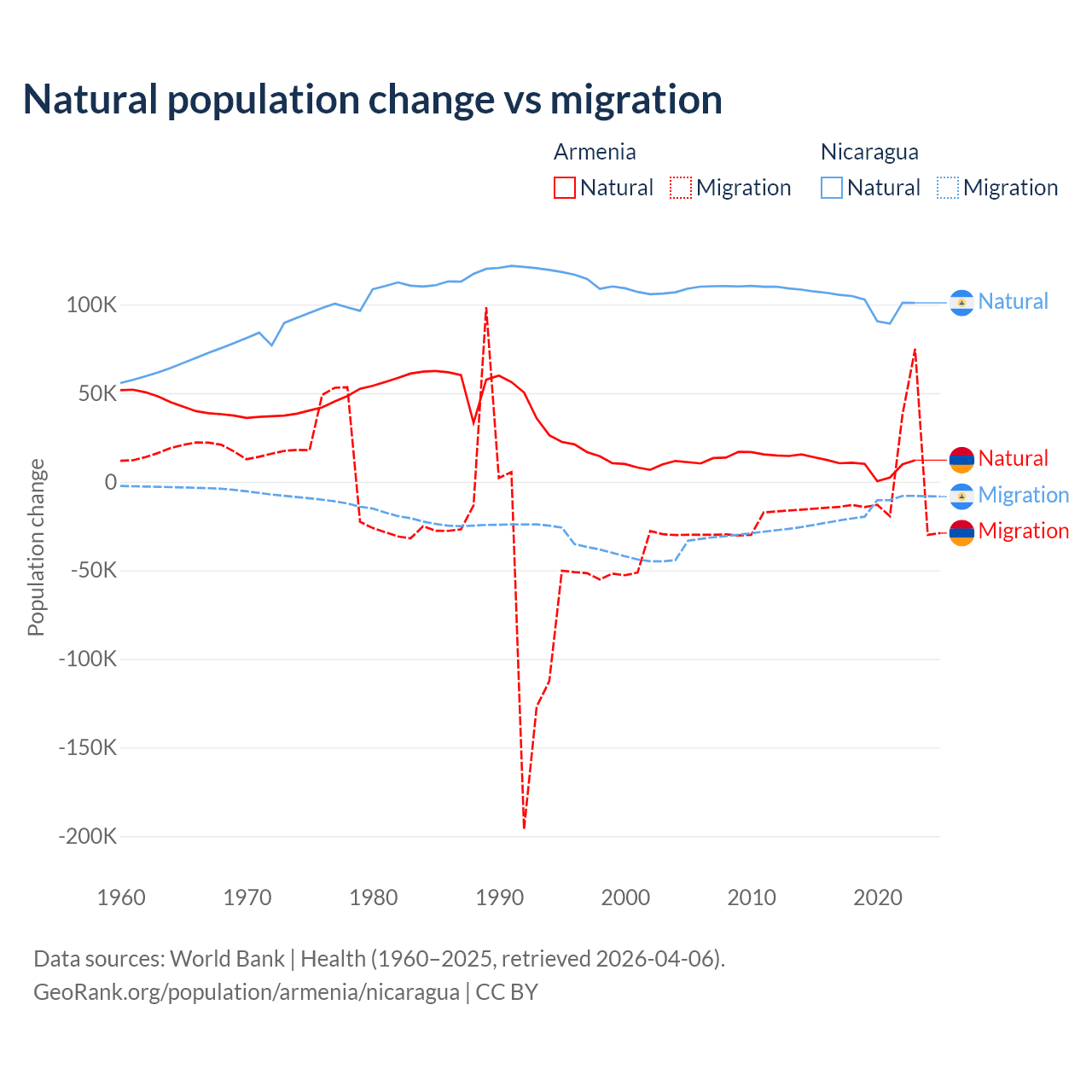 Over the last 10 years, 93.5% of the population change in Armenia is from natural causes (a gain of 97,267 people) and 6.54% is from migration (a loss of 6,808 people). In Nicaragua 85.5% is from natural causes (a gain of 1,017,084 people) and 14.5% is from migration (a loss of 172,078 people).