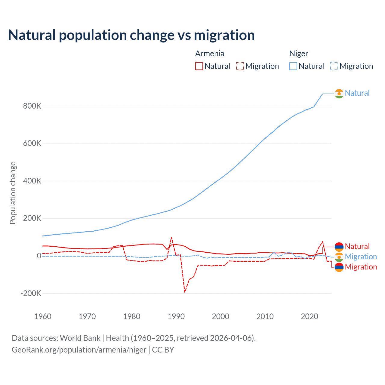 Over the last 10 years, 93.5% of the population change in Armenia is from natural causes (a gain of 97,267 people) and 6.54% is from migration (a loss of 6,808 people). In Niger 100% is from natural causes (a gain of 7,728,287 people) and 0.03% is from migration (a gain of 2,520 people).