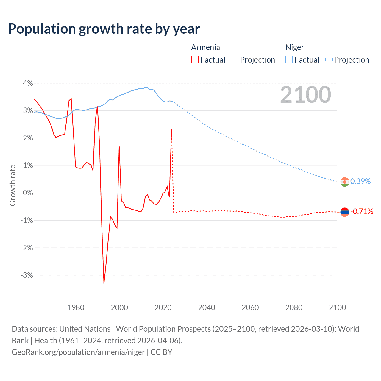 - For the last 10 years, Armenia has had an average growth rate of +0.04% per year vs +3.5% in Niger.