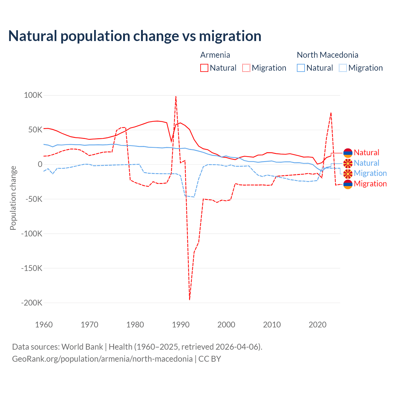 Over the last 10 years, 93.5% of the population change in Armenia is from natural causes (a gain of 97,267 people) and 6.54% is from migration (a loss of 6,808 people). In North Macedonia 6.45% is from natural causes (a loss of 12,585 people) and 93.5% is from migration (a loss of 182,429 people).