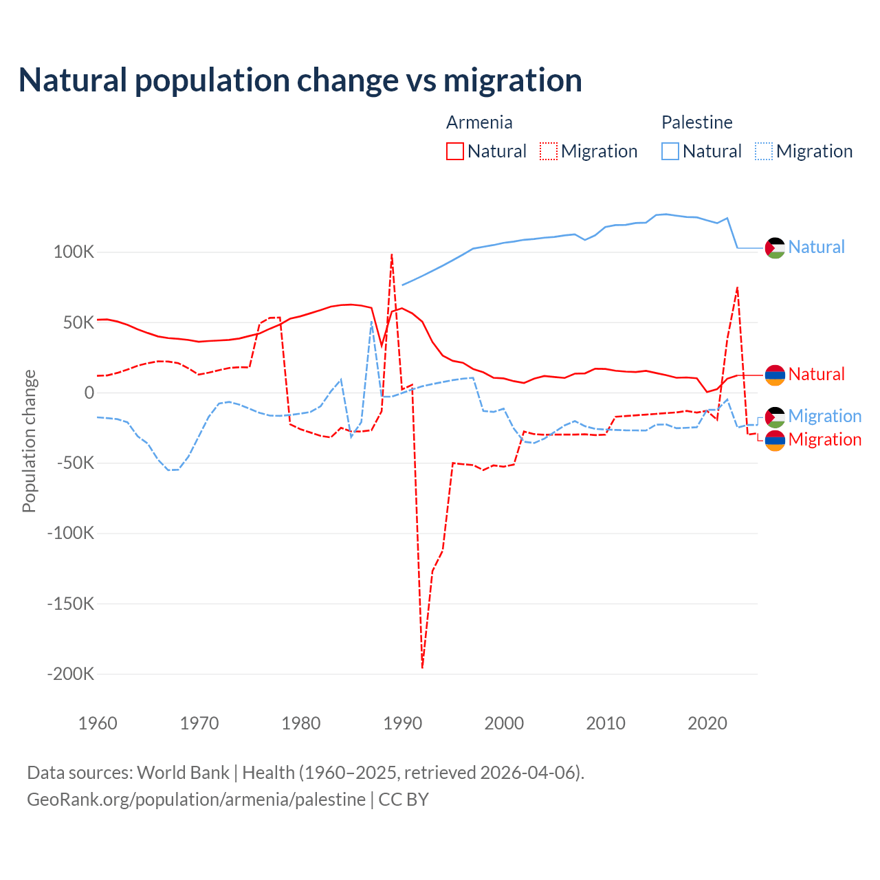 Over the last 10 years, 93.5% of the population change in Armenia is from natural causes (a gain of 97,267 people) and 6.54% is from migration (a loss of 6,808 people). In Palestine 85.7% is from natural causes (a gain of 1,218,010 people) and 14.3% is from migration (a loss of 202,820 people).