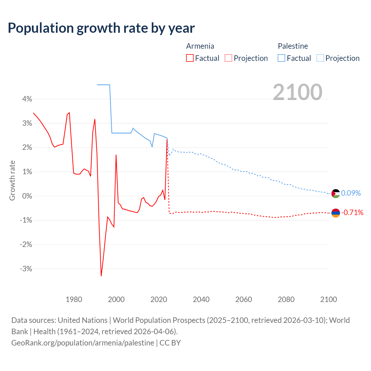 - For the last 10 years, Armenia has had an average growth rate of +0.04% per year vs +2.4% in Palestine.