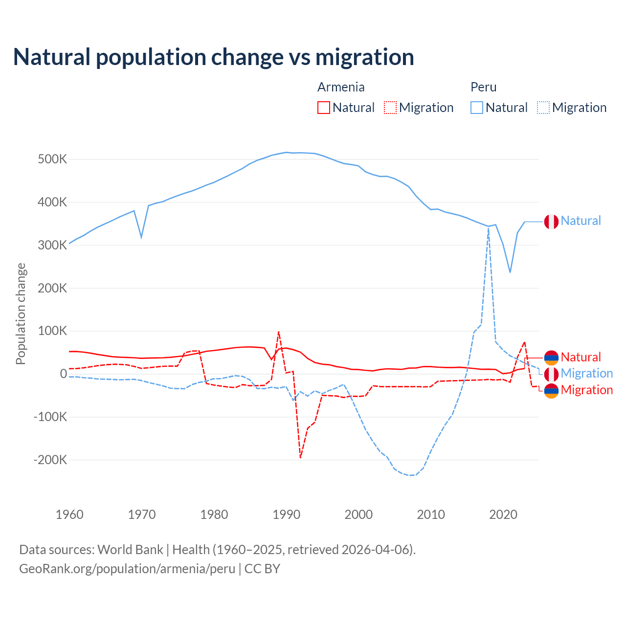 Over the last 10 years, 93.5% of the population change in Armenia is from natural causes (a gain of 97,267 people) and 6.54% is from migration (a loss of 6,808 people). In Peru 82% is from natural causes (a gain of 3,345,822 people) and 18% is from migration (a gain of 732,505 people).