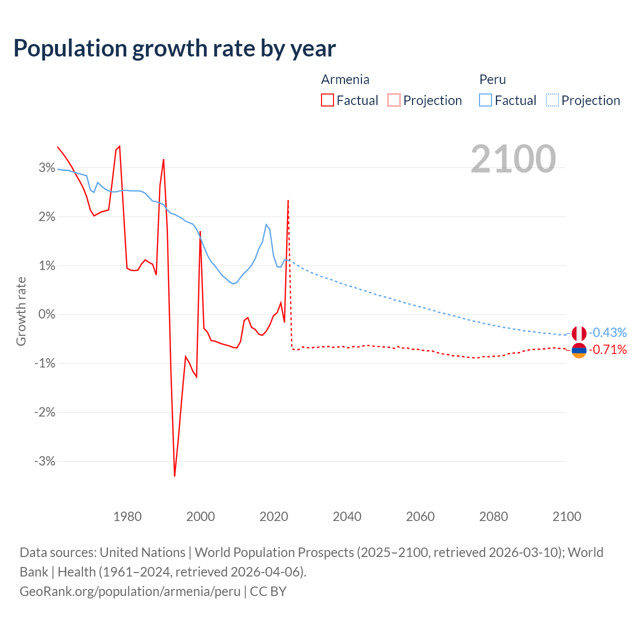 - For the last 10 years, Armenia has had an average growth rate of +0.04% per year vs +1.26% in Peru.