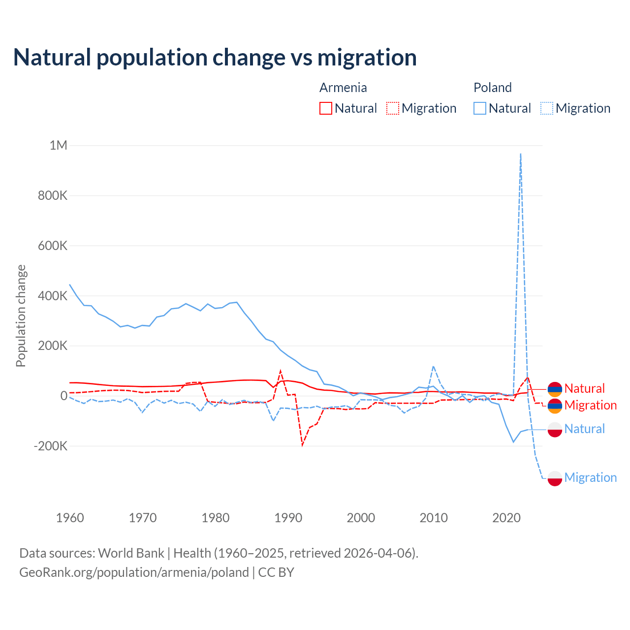 Over the last 10 years, 93.5% of the population change in Armenia is from natural causes (a gain of 97,267 people) and 6.54% is from migration (a loss of 6,808 people). In Poland 41.4% is from natural causes (a loss of 675,443 people) and 58.6% is from migration (a gain of 955,766 people).