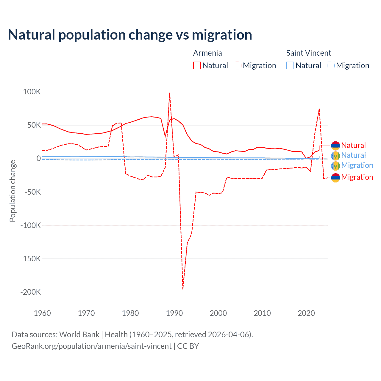 Over the last 10 years, 93.5% of the population change in Armenia is from natural causes (a gain of 97,267 people) and 6.54% is from migration (a loss of 6,808 people). In Saint Vincent 21.2% is from natural causes (a gain of 2,525 people) and 78.8% is from migration (a loss of 9,393 people).
