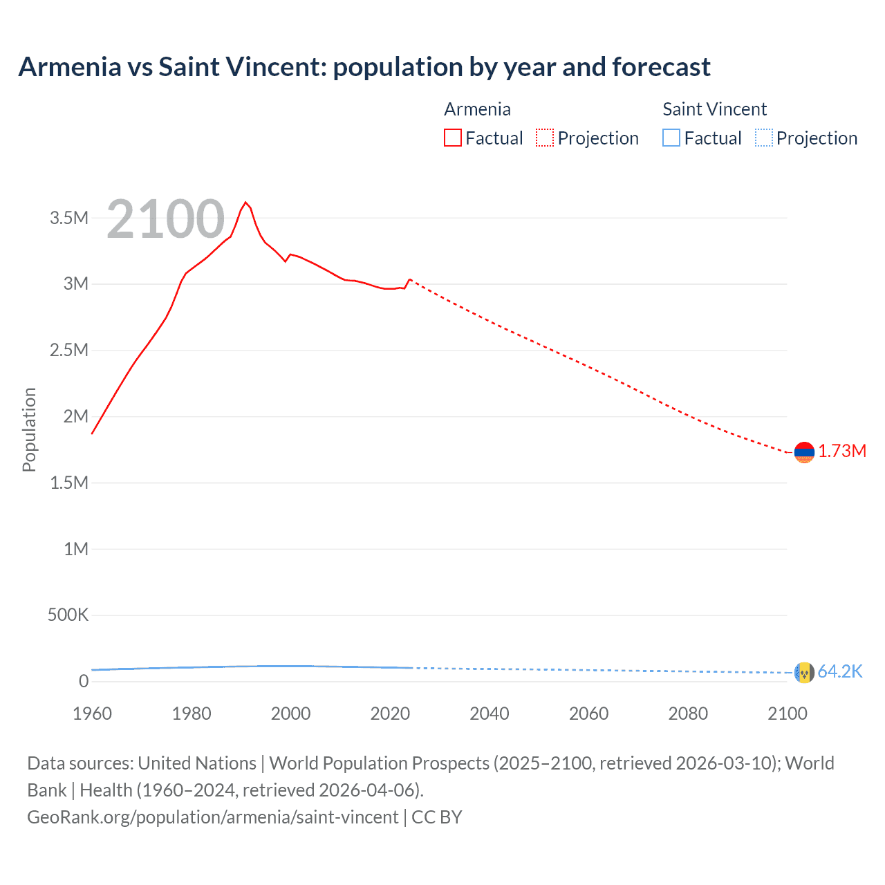 The latest officially reported population of Armenia was 3,033,500 in 2024 vs 100,616 people in Saint Vincent in 2024. In 2026, based on the adjusted UN estimation, the current Armenia's population is 2,989,841 people compared to 99,237 in Saint Vincent.