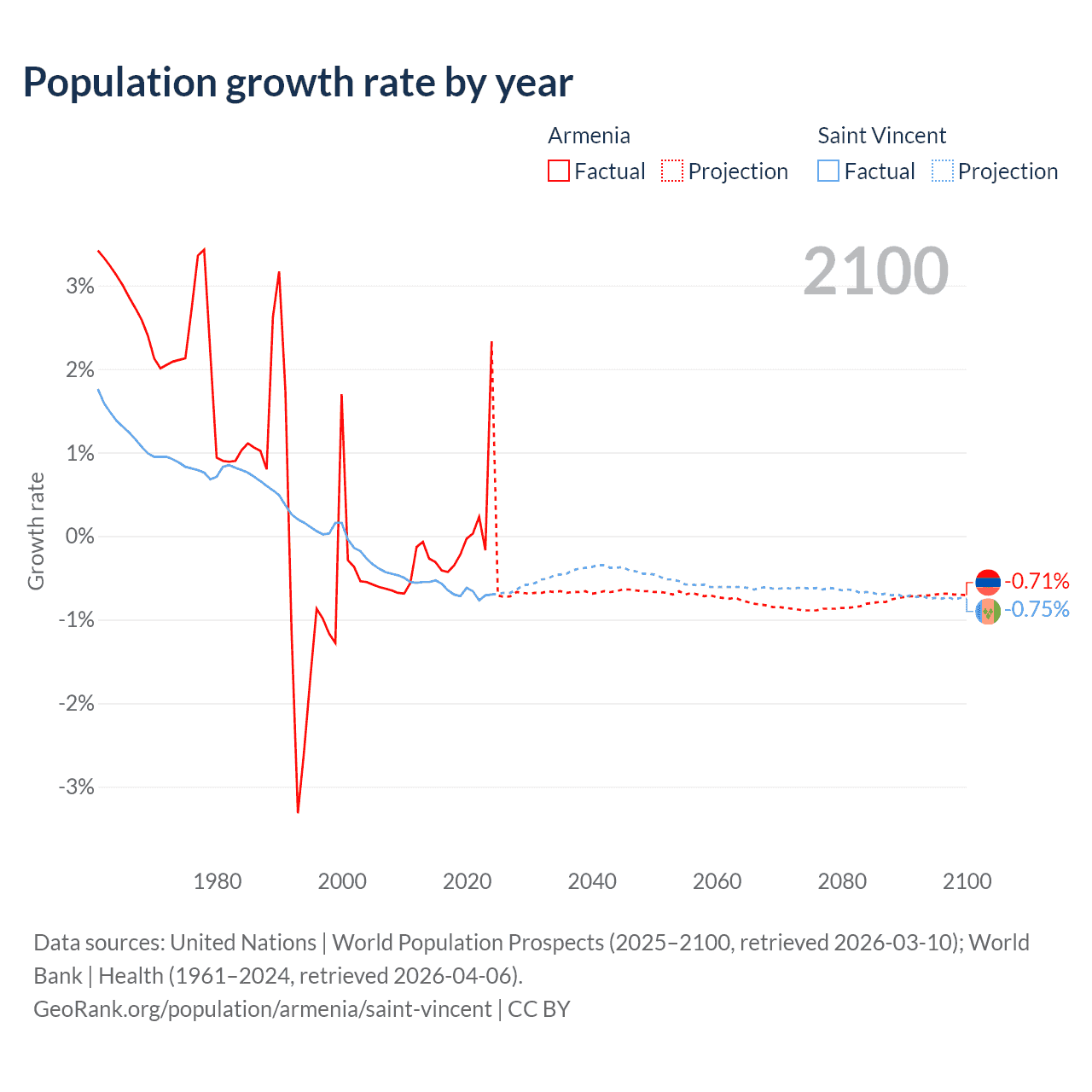 - For the last 10 years, Armenia has had an average growth rate of +0.04% per year vs -0.65% in Saint Vincent.