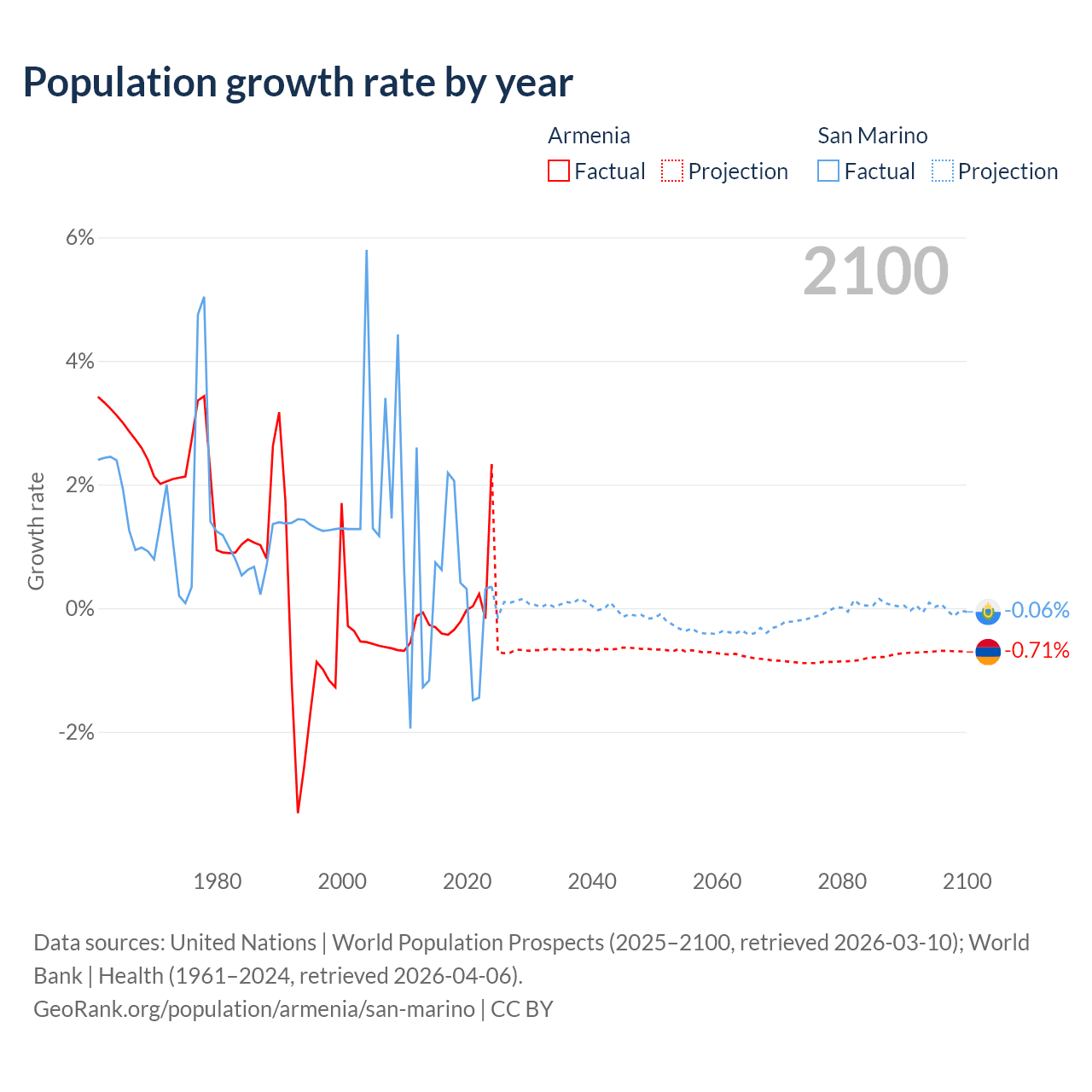 - For the last 10 years, Armenia has had an average growth rate of +0.04% per year vs +0.26% in San Marino.