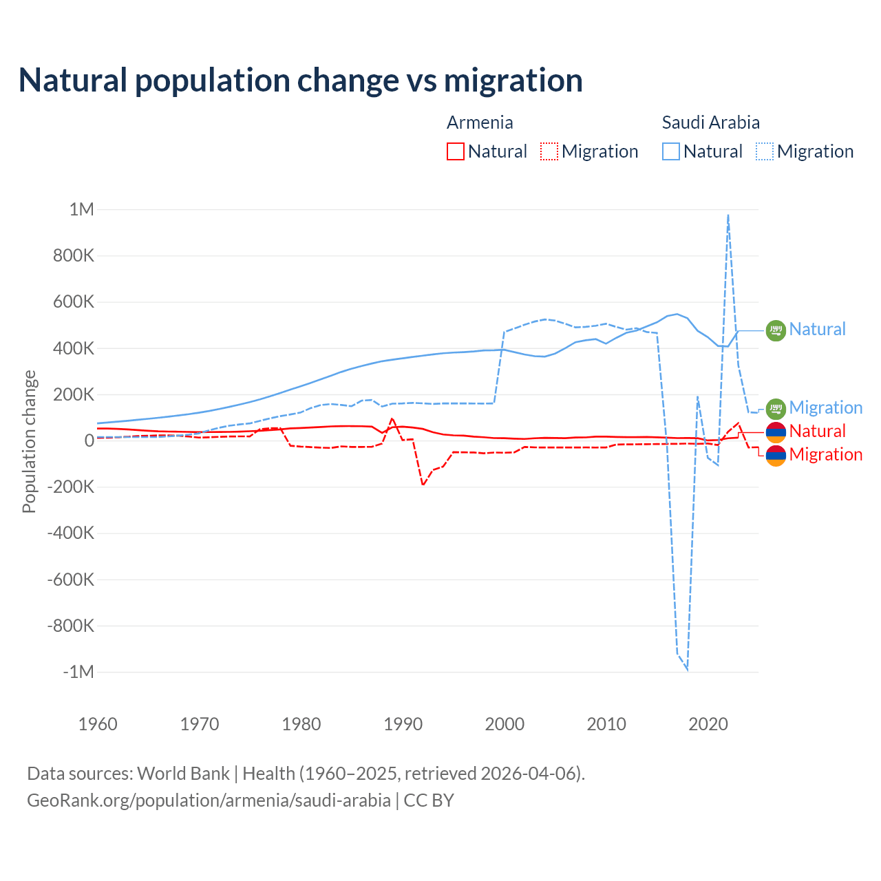Over the last 10 years, 93.5% of the population change in Armenia is from natural causes (a gain of 97,267 people) and 6.54% is from migration (a loss of 6,808 people). In Saudi Arabia 93.9% is from natural causes (a gain of 4,829,562 people) and 6.05% is from migration (a gain of 311,209 people).