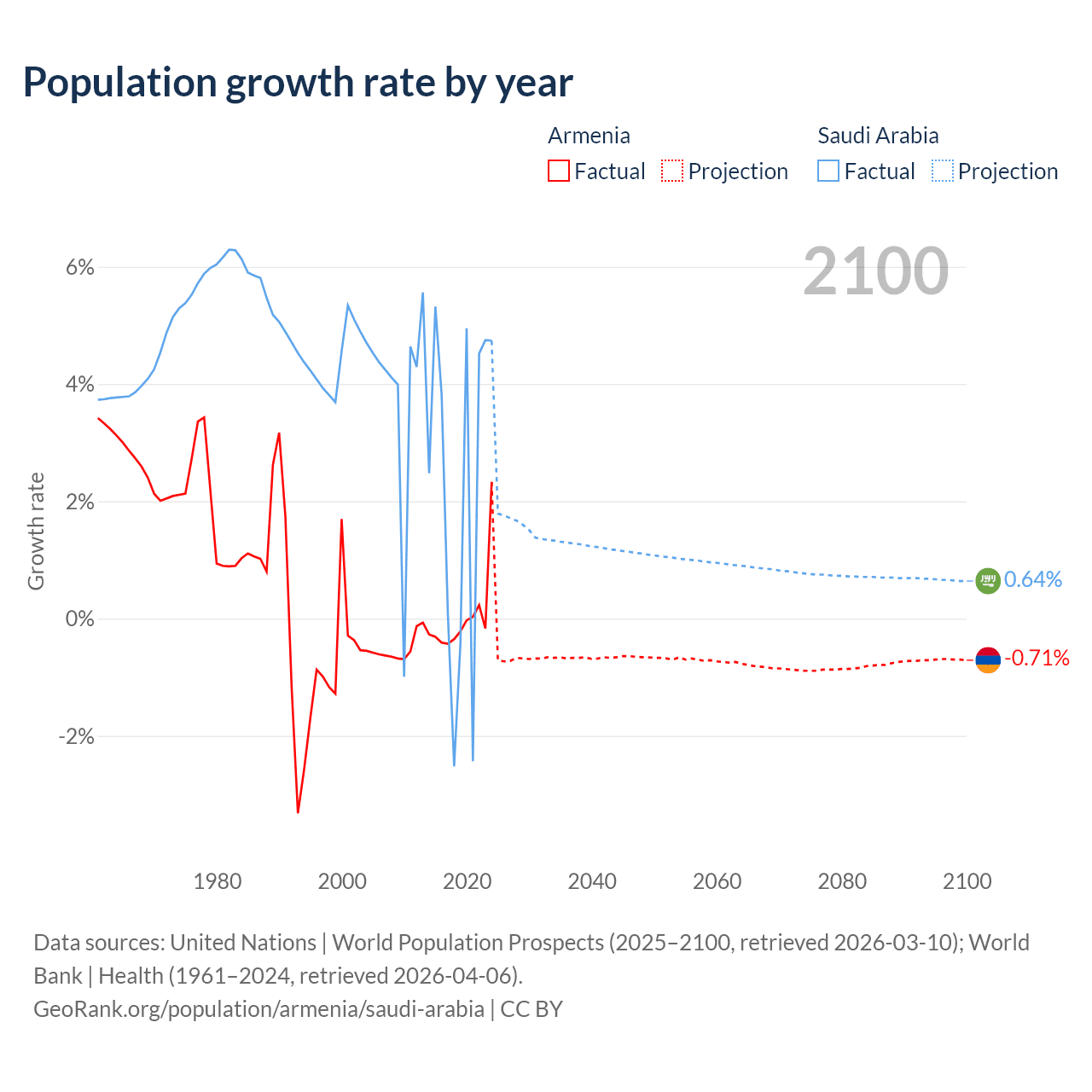 - For the last 10 years, Armenia has had an average growth rate of +0.04% per year vs +2.3% in Saudi Arabia.
