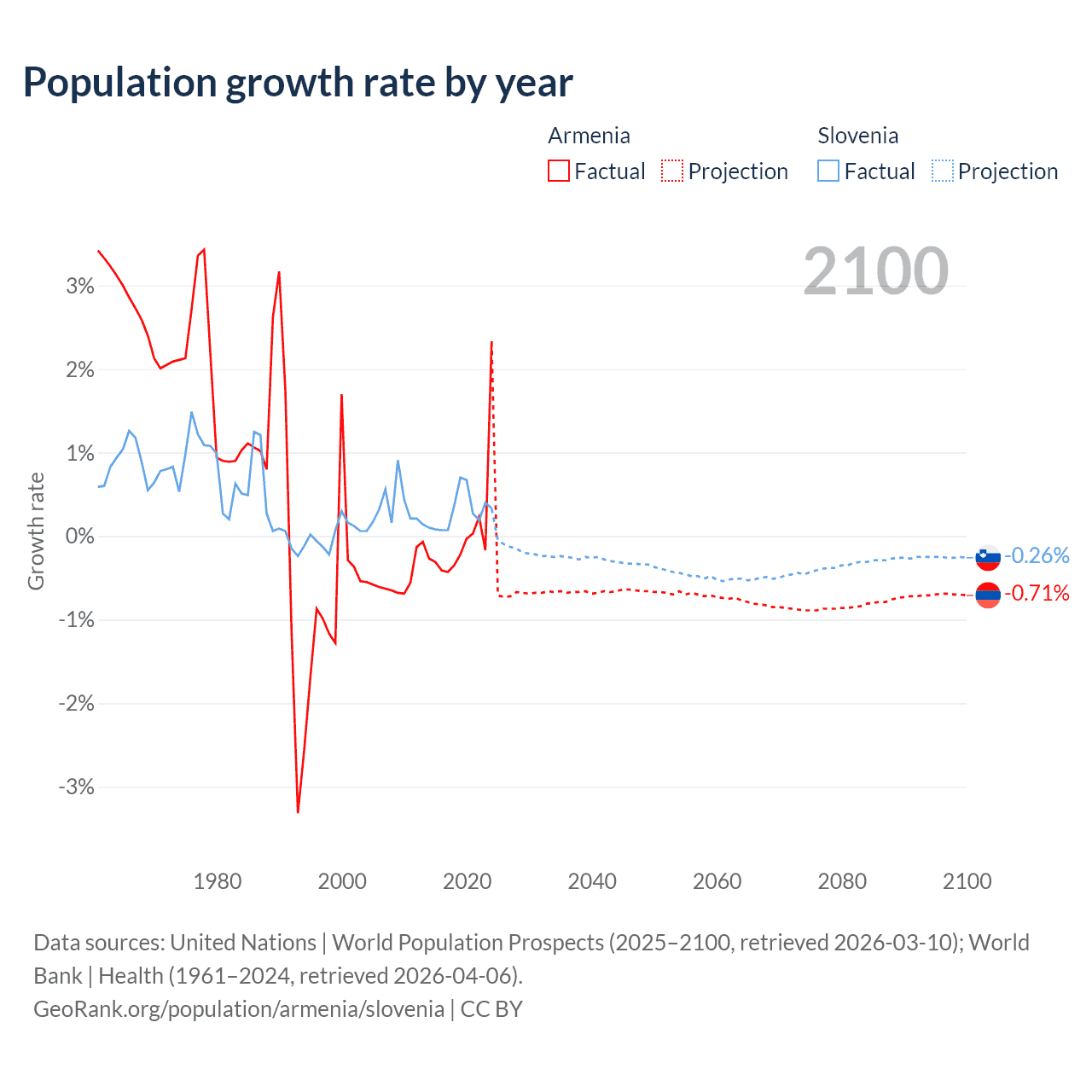 - For the last 10 years, Armenia has had an average growth rate of +0.04% per year vs +0.29% in Slovenia.