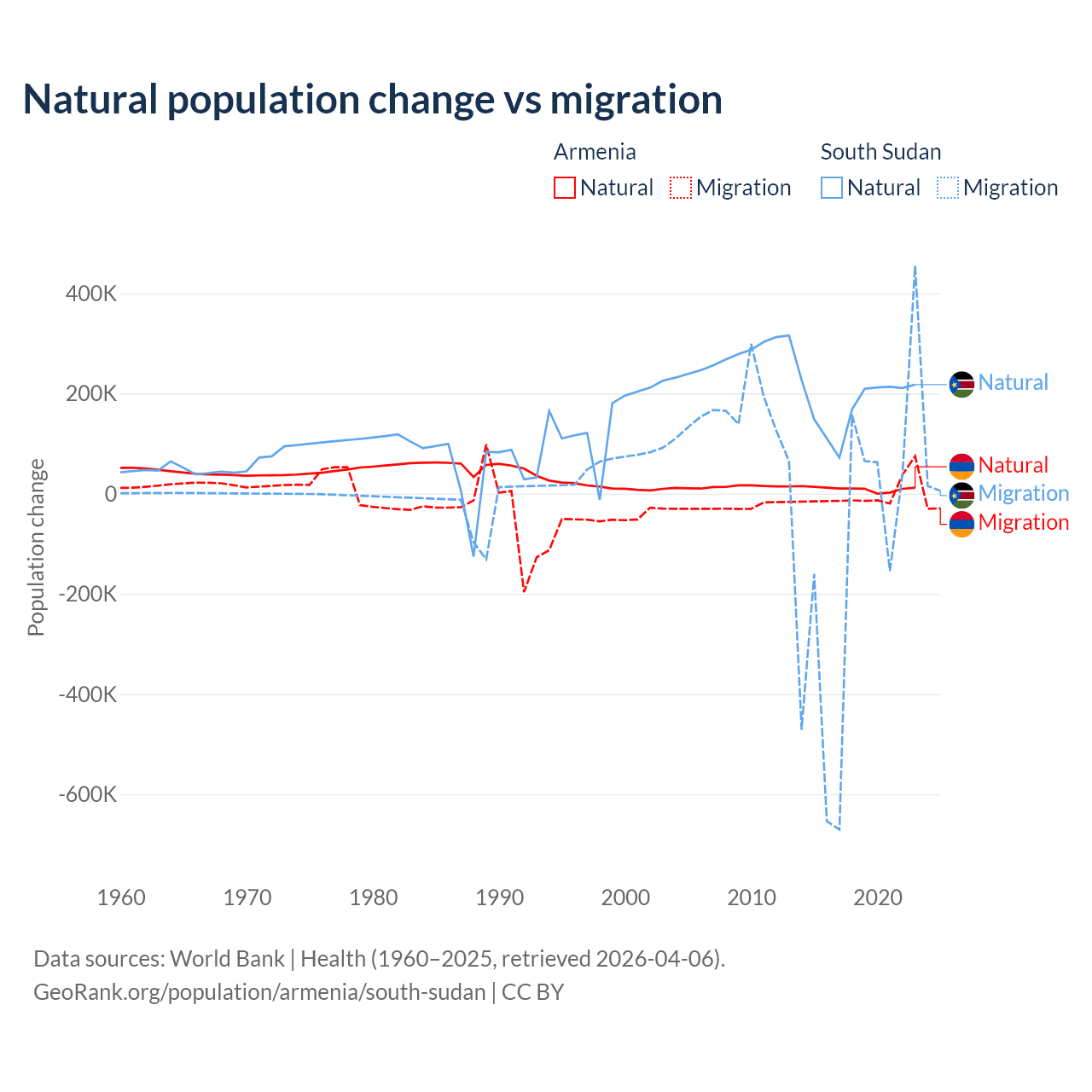 Over the last 10 years, 93.5% of the population change in Armenia is from natural causes (a gain of 97,267 people) and 6.54% is from migration (a loss of 6,808 people). In South Sudan 57.4% is from natural causes (a gain of 1,792,135 people) and 42.6% is from migration (a loss of 1,329,606 people).