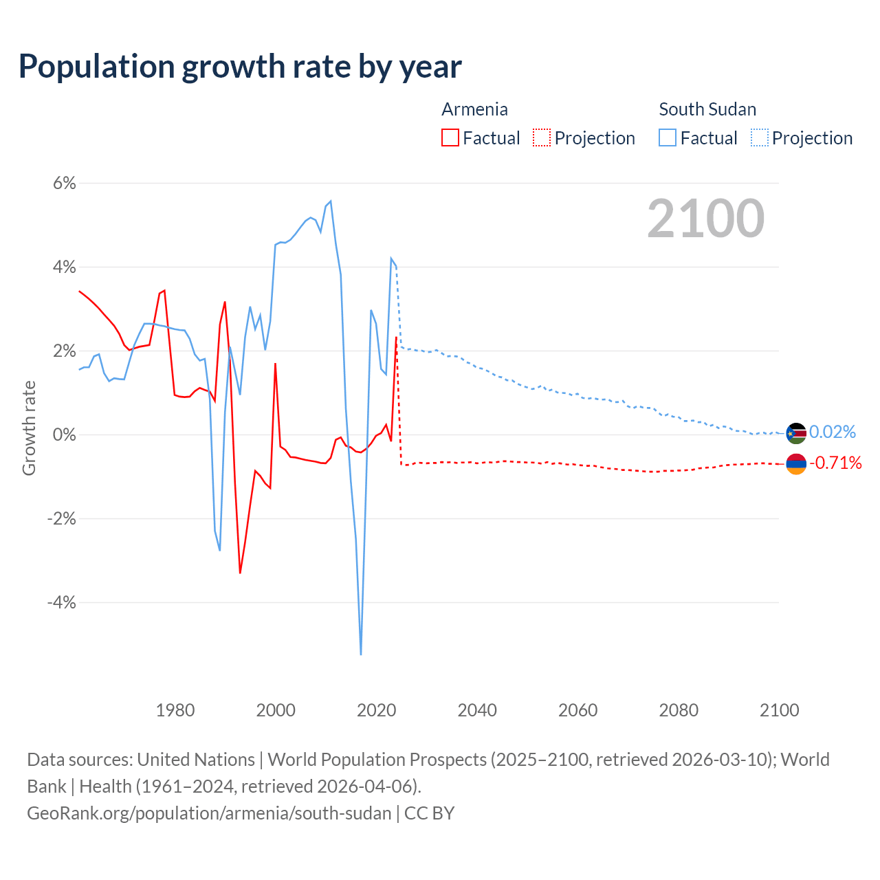 - For the last 10 years, Armenia has had an average growth rate of +0.04% per year vs +0.65% in South Sudan.