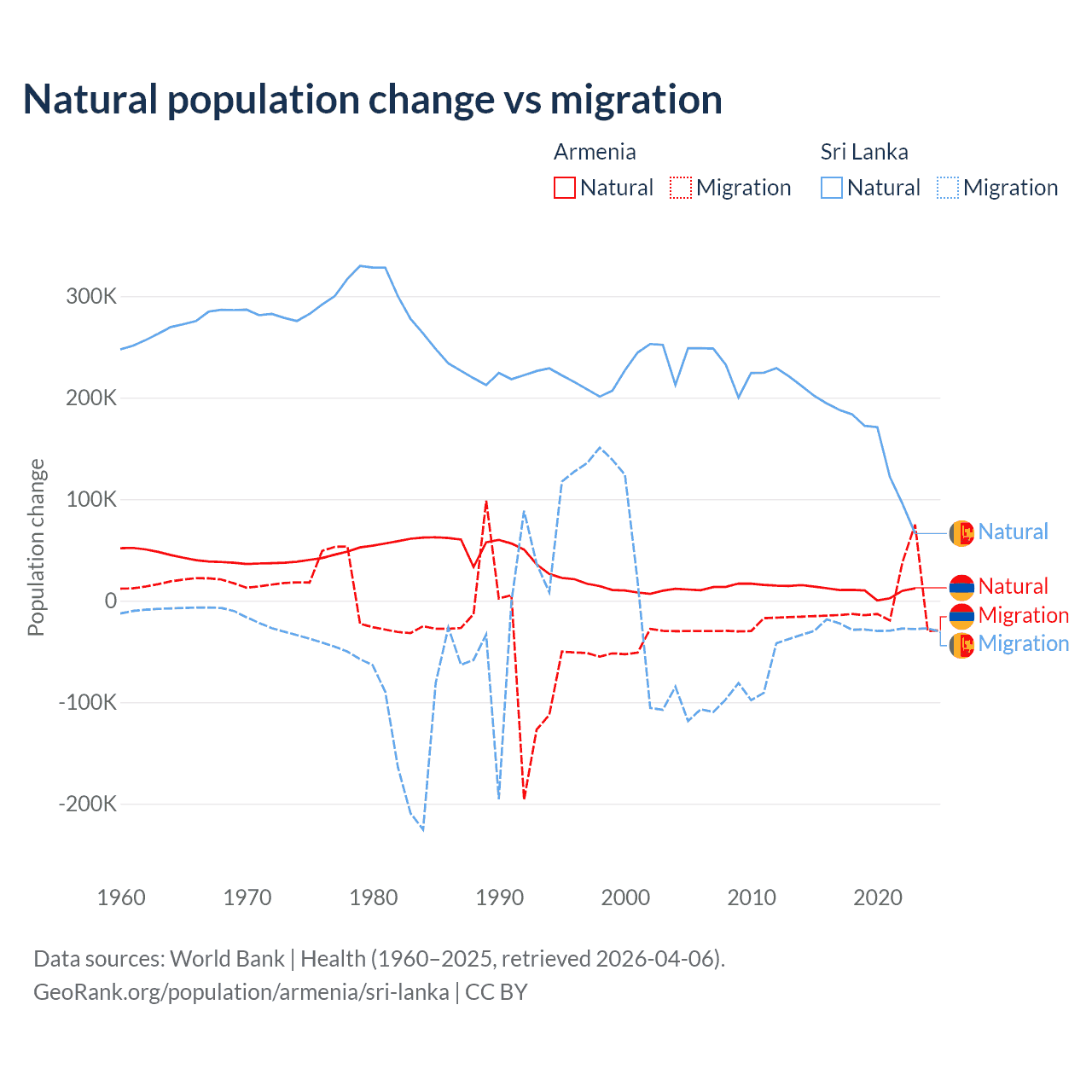 Over the last 10 years, 93.5% of the population change in Armenia is from natural causes (a gain of 97,267 people) and 6.54% is from migration (a loss of 6,808 people). In Sri Lanka 85.3% is from natural causes (a gain of 1,605,749 people) and 14.7% is from migration (a loss of 276,121 people).