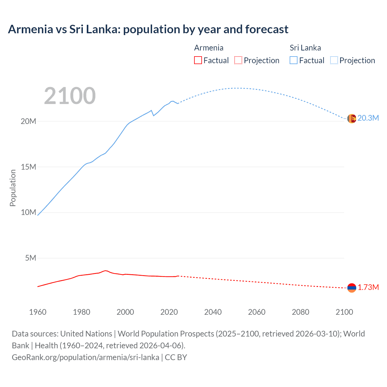 The latest officially reported population of Armenia was 3,033,500 in 2024 vs 21,916,000 people in Sri Lanka in 2024. In 2026, based on the adjusted UN estimation, the current Armenia's population is 2,989,841 people compared to 22,185,425 in Sri Lanka.