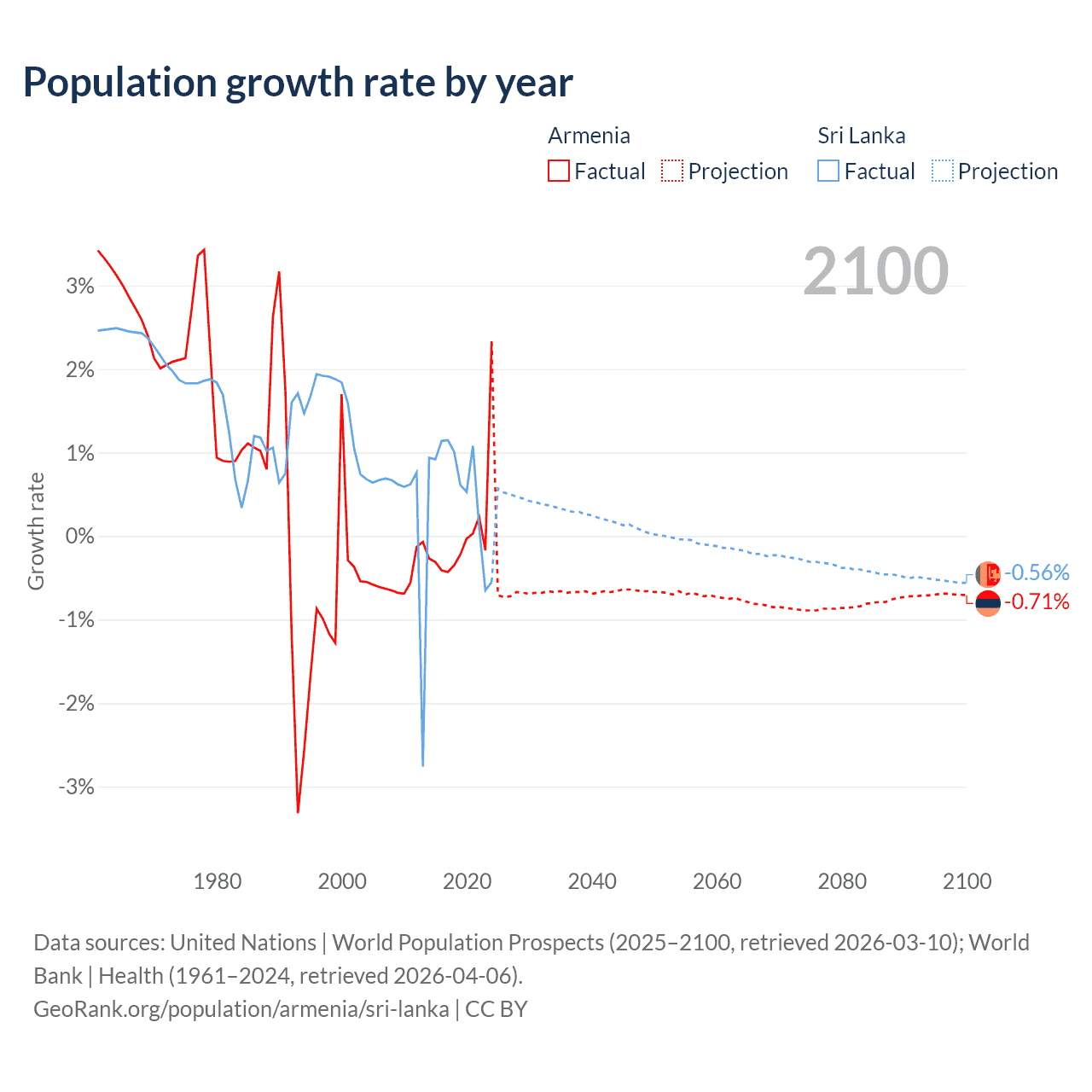 - For the last 10 years, Armenia has had an average growth rate of +0.04% per year vs +0.57% in Sri Lanka.
