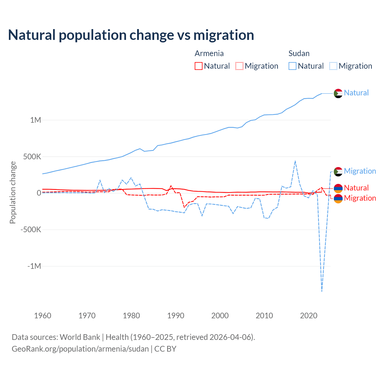 Over the last 10 years, 93.5% of the population change in Armenia is from natural causes (a gain of 97,267 people) and 6.54% is from migration (a loss of 6,808 people). In Sudan 95.1% is from natural causes (a gain of 12,459,977 people) and 4.88% is from migration (a loss of 639,596 people).