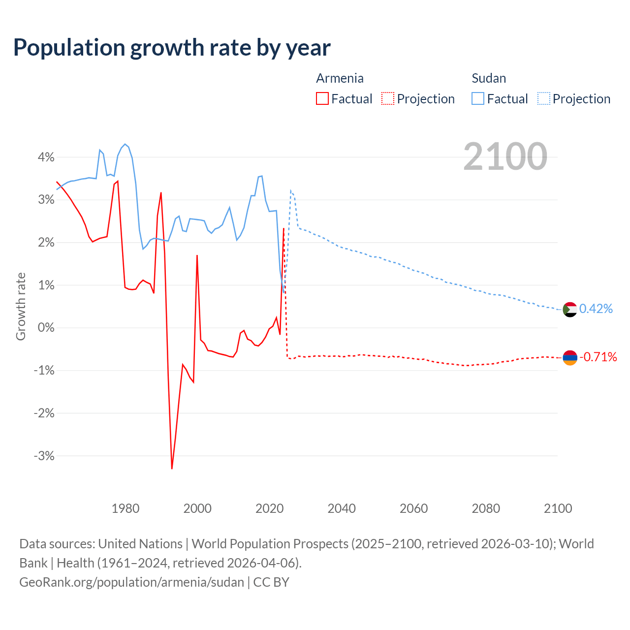 - For the last 10 years, Armenia has had an average growth rate of +0.04% per year vs +2.67% in Sudan.