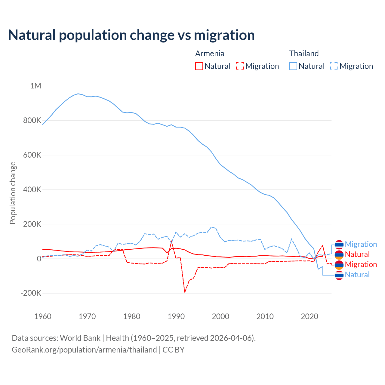 Over the last 10 years, 93.5% of the population change in Armenia is from natural causes (a gain of 97,267 people) and 6.54% is from migration (a loss of 6,808 people). In Thailand 78.4% is from natural causes (a gain of 1,292,528 people) and 21.6% is from migration (a gain of 355,361 people).