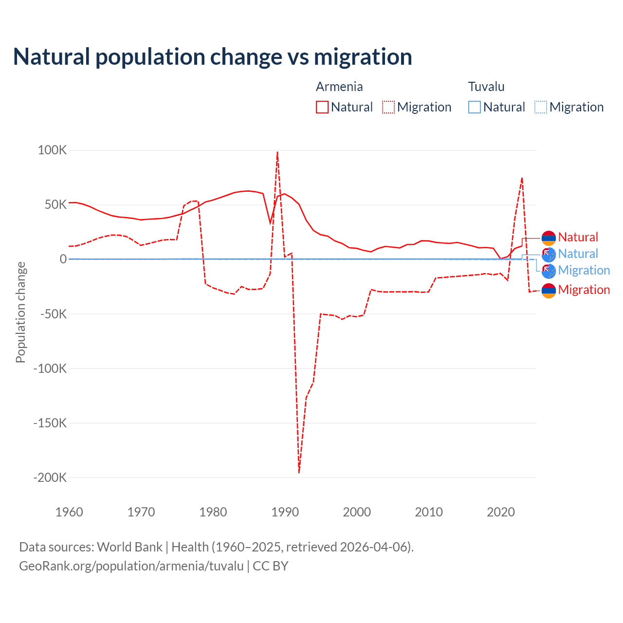 Over the last 10 years, 93.5% of the population change in Armenia is from natural causes (a gain of 97,267 people) and 6.54% is from migration (a loss of 6,808 people). In Tuvalu 35.5% is from natural causes (a gain of 1,556 people) and 64.5% is from migration (a loss of 2,827 people).