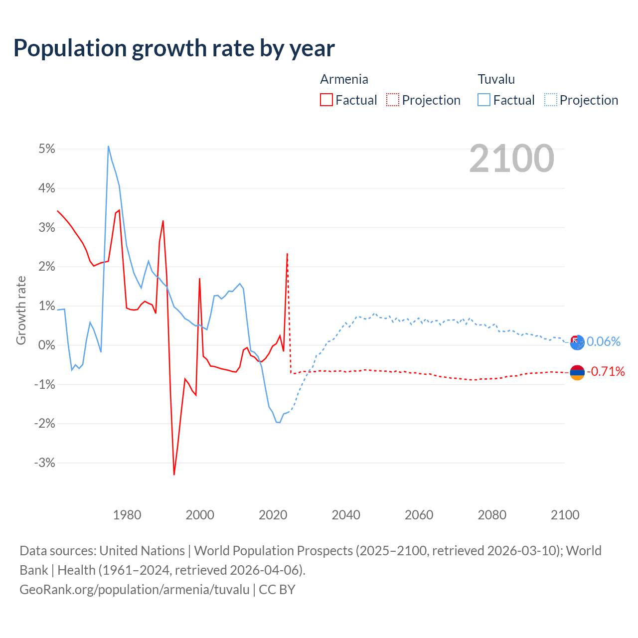 - For the last 10 years, Armenia has had an average growth rate of +0.04% per year vs -1.19% in Tuvalu.