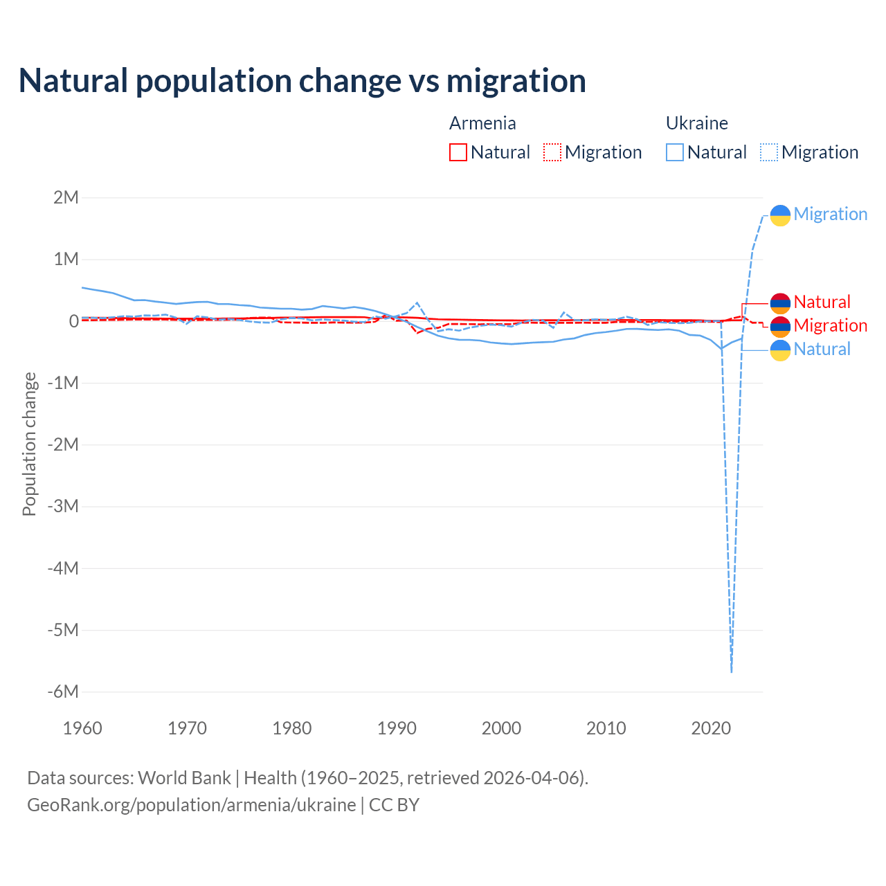 Over the last 10 years, 93.5% of the population change in Armenia is from natural causes (a gain of 97,267 people) and 6.54% is from migration (a loss of 6,808 people). In Ukraine 28.2% is from natural causes (a loss of 2,435,153 people) and 71.8% is from migration (a loss of 6,198,995 people).