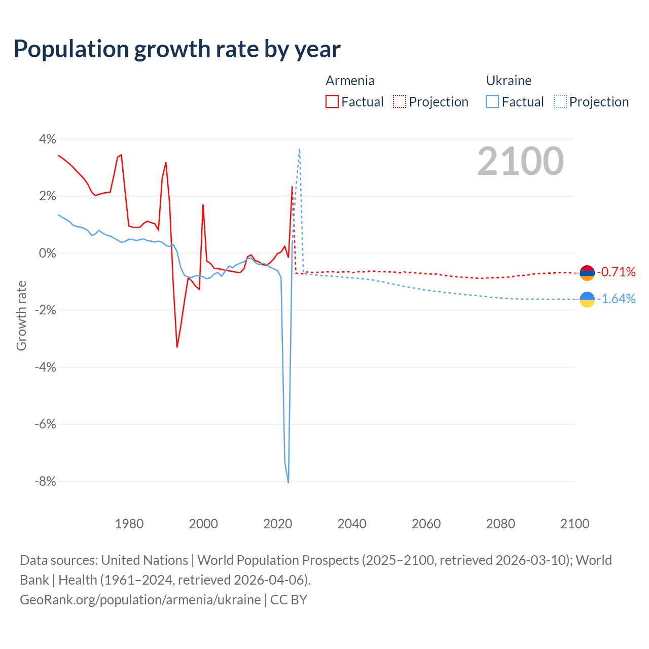 - For the last 10 years, Armenia has had an average growth rate of +0.04% per year vs -1.74% in Ukraine.