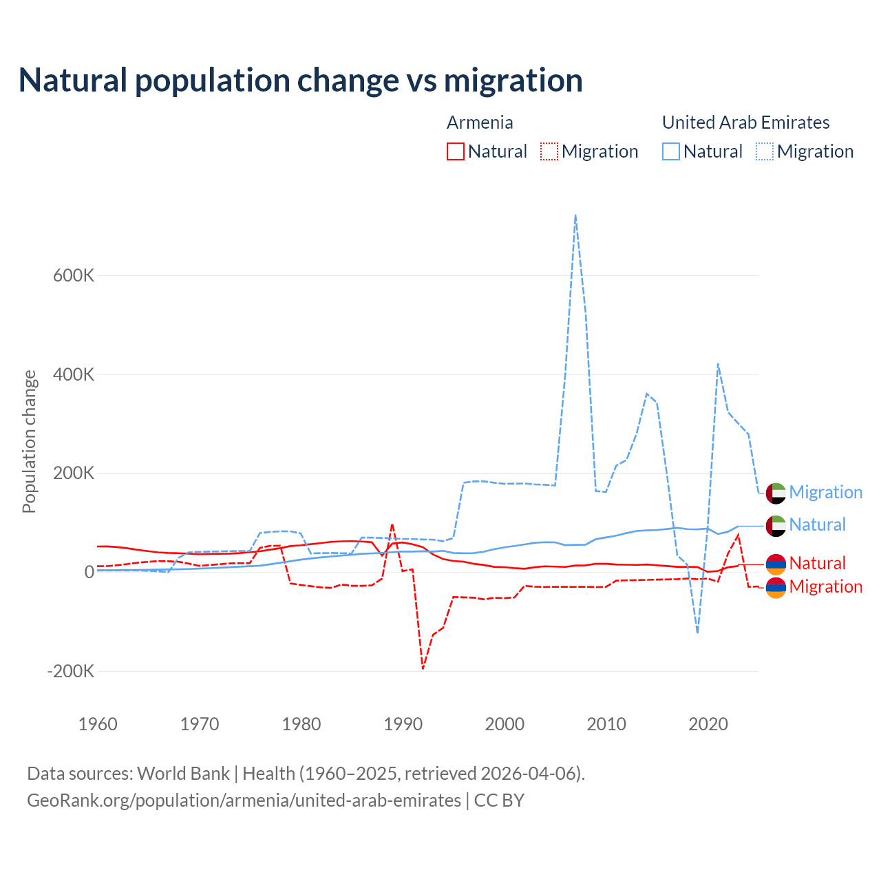 Over the last 10 years, 93.5% of the population change in Armenia is from natural causes (a gain of 97,267 people) and 6.54% is from migration (a loss of 6,808 people). In the United Arab Emirates 30.5% is from natural causes (a gain of 857,996 people) and 69.5% is from migration (a gain of 1,958,520 people).