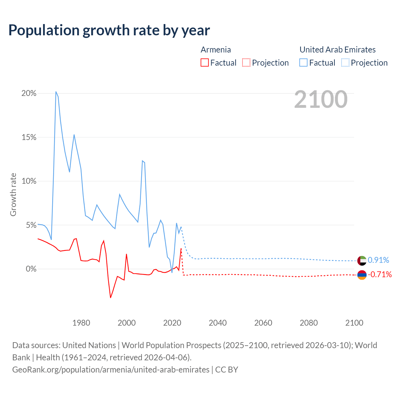 - For the last 10 years, Armenia has had an average growth rate of +0.04% per year vs +3.31% in the United Arab Emirates.