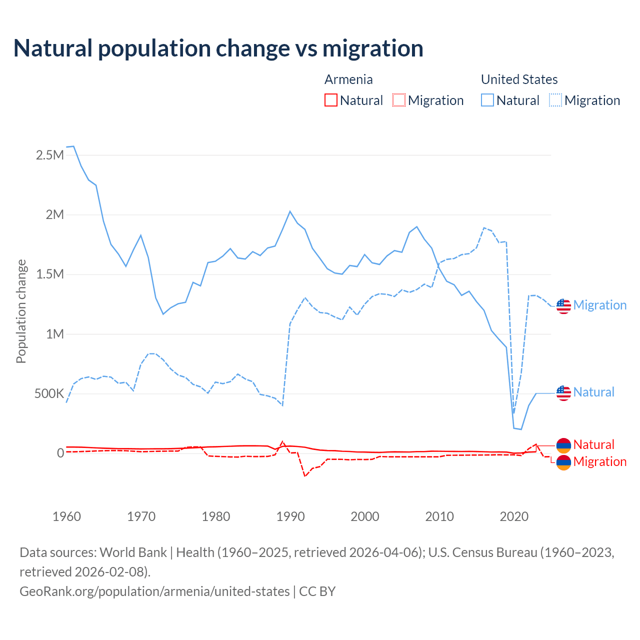 Over the last 10 years, 93.5% of the population change in Armenia is from natural causes (a gain of 97,267 people) and 6.54% is from migration (a loss of 6,808 people). In the United States 35.8% is from natural causes (a gain of 8,005,866 people) and 64.2% is from migration (a gain of 14,334,286 people).