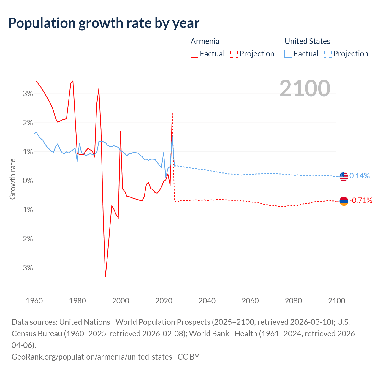 - For the last 10 years, Armenia has had an average growth rate of +0.04% per year vs +0.65% in the United States.