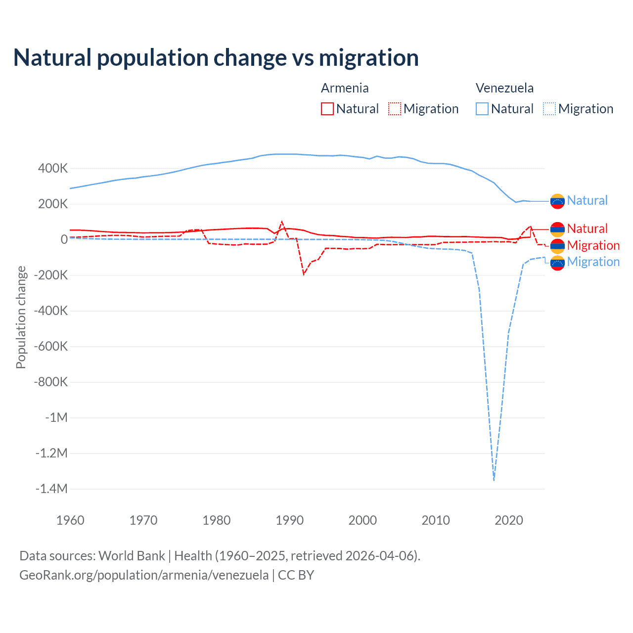 Over the last 10 years, 93.5% of the population change in Armenia is from natural causes (a gain of 97,267 people) and 6.54% is from migration (a loss of 6,808 people). In Venezuela 38.6% is from natural causes (a gain of 2,946,257 people) and 61.4% is from migration (a loss of 4,683,227 people).