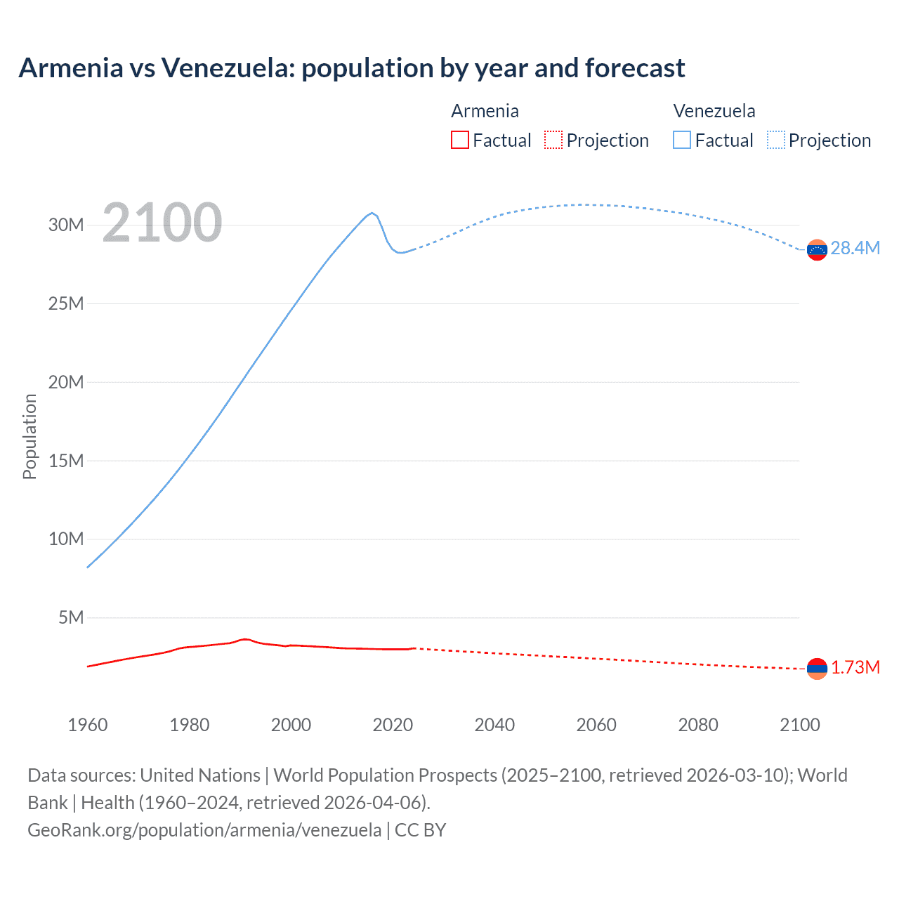 The latest officially reported population of Armenia was 3,033,500 in 2024 vs 28,405,543 people in Venezuela in 2024. In 2026, based on the adjusted UN estimation, the current Armenia's population is 2,989,841 people compared to 28,661,242 in Venezuela.
