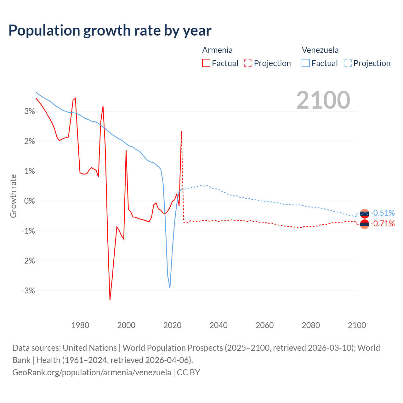 - For the last 10 years, Armenia has had an average growth rate of +0.04% per year vs -0.46% in Venezuela.