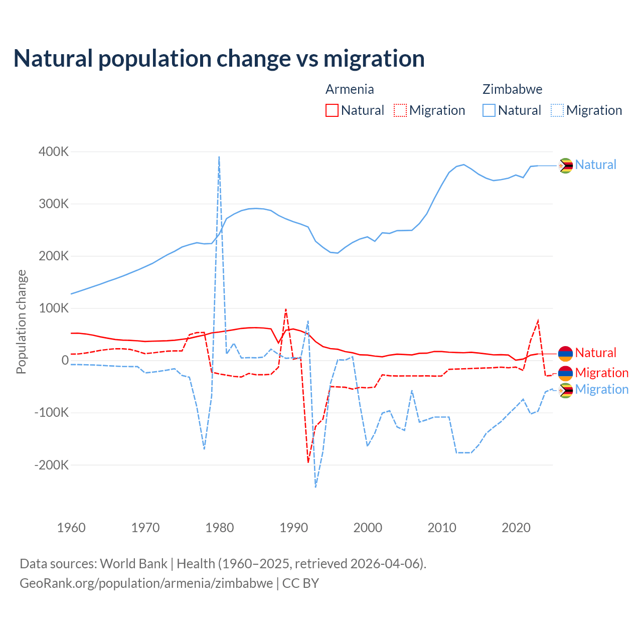 Over the last 10 years, 93.5% of the population change in Armenia is from natural causes (a gain of 97,267 people) and 6.54% is from migration (a loss of 6,808 people). In Zimbabwe 74.9% is from natural causes (a gain of 3,558,487 people) and 25.1% is from migration (a loss of 1,192,807 people).