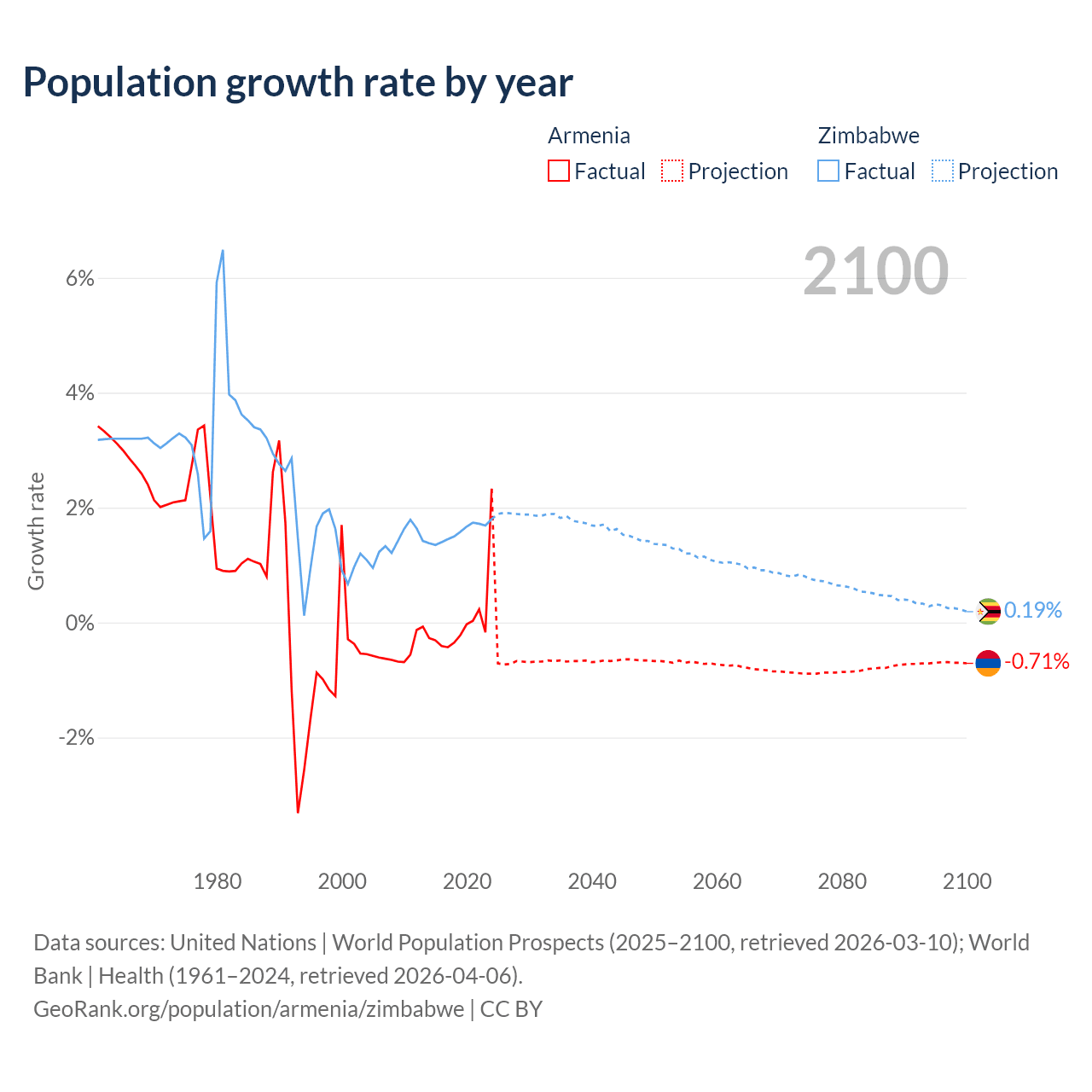 - For the last 10 years, Armenia has had an average growth rate of +0.04% per year vs +1.57% in Zimbabwe.
