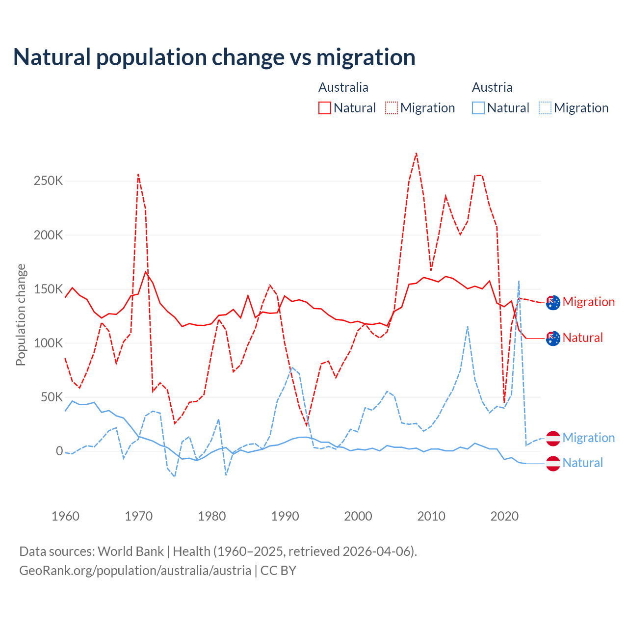 Over the last 10 years, 43.6% of the population change in Australia is from natural causes (a gain of 1,389,408 people) and 56.4% is from migration (a gain of 1,798,171 people). In Austria 2.61% is from natural causes (a loss of 16,936 people) and 97.4% is from migration (a gain of 631,325 people).