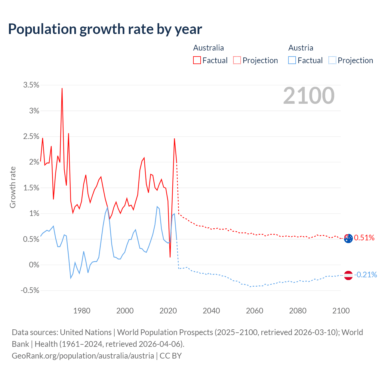 - For the last 10 years, Australia has had an average growth rate of +1.49% per year vs +0.72% in Austria.