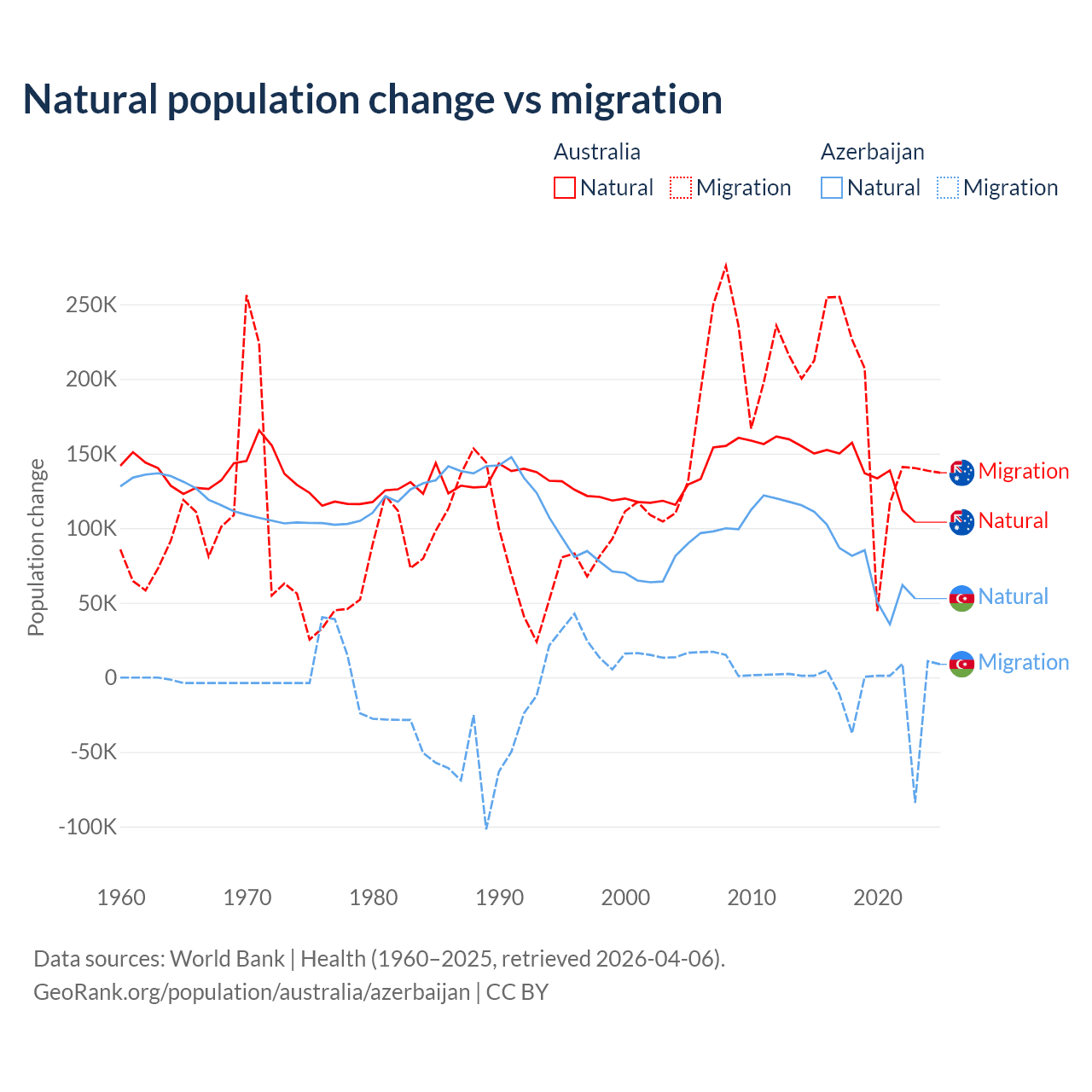 Over the last 10 years, 43.6% of the population change in Australia is from natural causes (a gain of 1,389,408 people) and 56.4% is from migration (a gain of 1,798,171 people). In Azerbaijan 87.2% is from natural causes (a gain of 782,840 people) and 12.8% is from migration (a loss of 114,572 people).