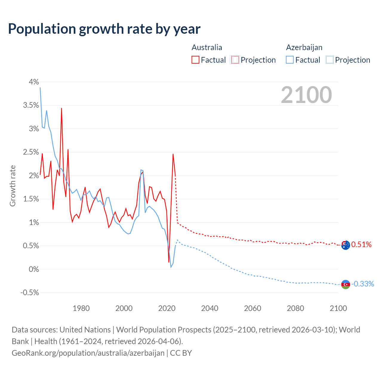- For the last 10 years, Australia has had an average growth rate of +1.49% per year vs +0.73% in Azerbaijan.
