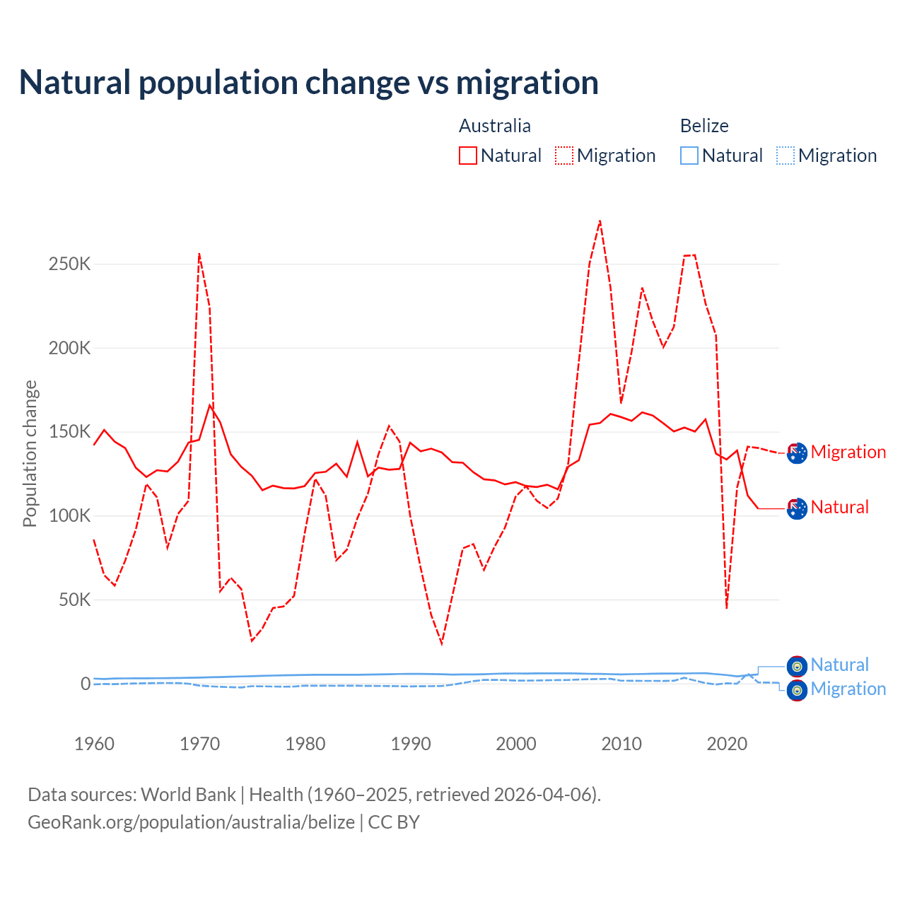 Over the last 10 years, 43.6% of the population change in Australia is from natural causes (a gain of 1,389,408 people) and 56.4% is from migration (a gain of 1,798,171 people). In Belize 79.6% is from natural causes (a gain of 54,754 people) and 20.4% is from migration (a gain of 14,073 people).