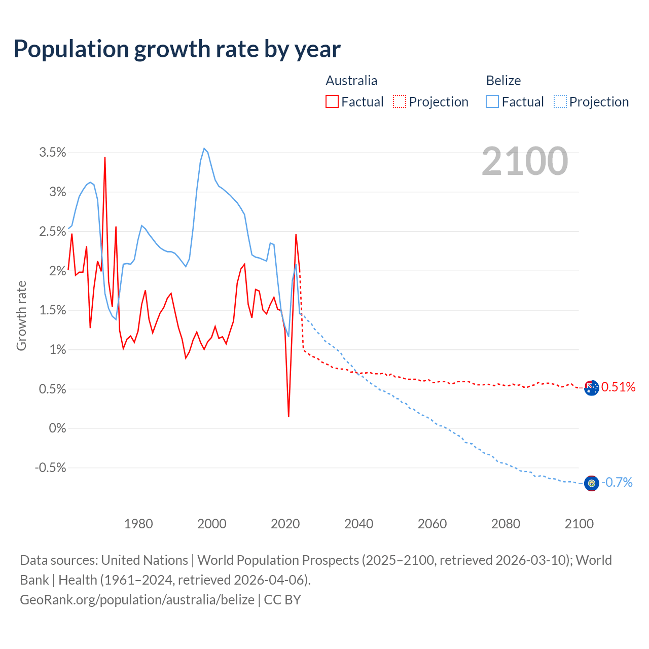 - For the last 10 years, Australia has had an average growth rate of +1.49% per year vs +1.83% in Belize.