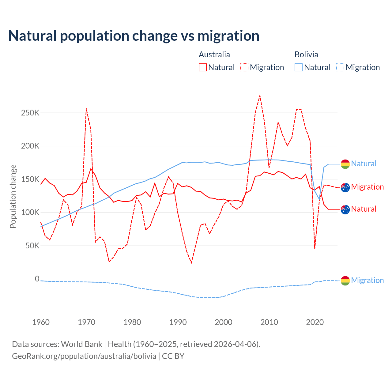 Over the last 10 years, 43.6% of the population change in Australia is from natural causes (a gain of 1,389,408 people) and 56.4% is from migration (a gain of 1,798,171 people). In Bolivia 95.6% is from natural causes (a gain of 1,637,833 people) and 4.37% is from migration (a loss of 74,903 people).