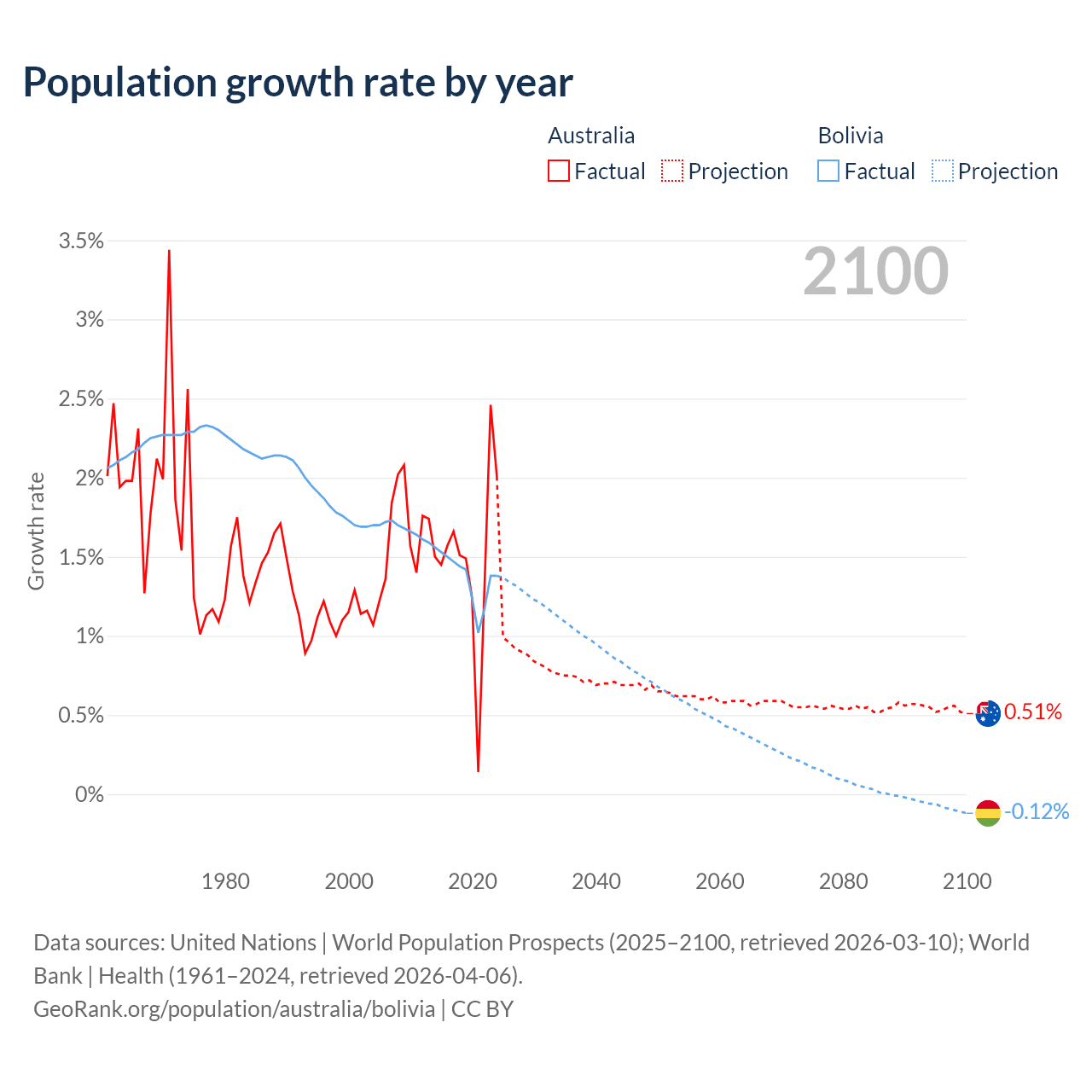 - For the last 10 years, Australia has had an average growth rate of +1.49% per year vs +1.37% in Bolivia.